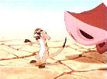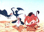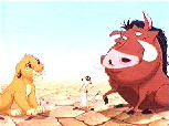 Simba liegt in der Mittagssonne am Rand einer Wüste. Die Geier kreisen schon über ihm und wollen ihn fressen. Plötzlich taucht ein Warzenschwein (Pumbaa) auf, auf dem ein Erdmännchen (Timon) reitet. Sie verscheuchen die Geier und bringen den Löwenjungen in den Schatten. Simba möchte den beiden nichts von seiner Vergangenheit erzählen und Timon sagt ihm, dass schlimme Dinge passieren und man die Vergangenheit hinter sich lassen soll. Mit dem Spruch "Hakuna Matata" ließen sich alle Sorgen vergessen.